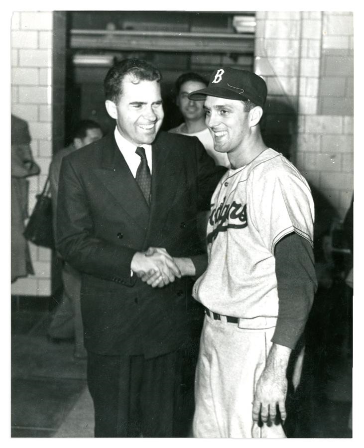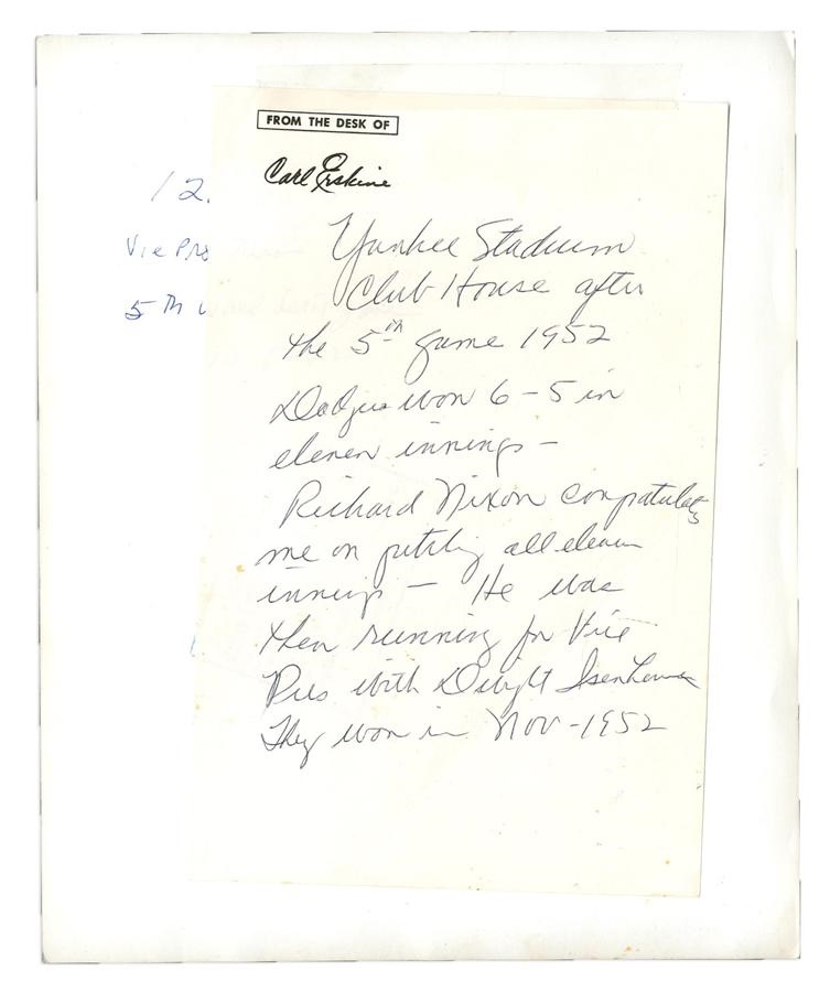 From the Erskine collection, this 8x10" Type I photo shows then-Vice President Richard Nixon shaking hands with Dodgers player Carl Erskine. To immortalize a memorable and important moment in his life, he wrote a letter on his stationery (5.5x8.5"), capturing it for the ages, and he signs his name over the printed "Carl Erksine" on his letterhead. In his hand, written clearly in black ink, is "Yankee Stadium Club House after the 5th game 1952 Dodgers won 6-5 in eleven innings - Richard Nixon congratulate me on pitching all eleven innings..." The letter is attached with tape but can easily be removed. Also, Carl Erskine wrote information on the back of the photo. Condition overall is EX+ to NRMT.