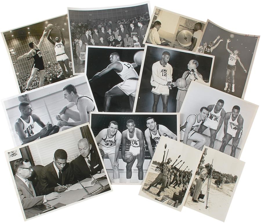 After picking through thousands of sports photos from the Cincinnati Enquirer files, these ten Type I photos were chosen to represent, with photographer stamps, the early career of Oscar Robertson at the University of Cincinnati and the Royals from 1957-1960. Four are of the Royals and have Twyman in the shot, stamped by the photographer on the verso. One has Thyman and Thacker, stamped by photographer Whitteker, and a few have 1961 thru 1963 date stamps. One depicts Oscar signing a contract with the Cincinnati Royals, date stamped 1960; University of CIncinatti, date stamped 1957, when he was only 19; University of Cincinnati, team shot after winning championship game, stamped by photographer; beautiful action shot of just Oscar, stamped by Whitteker; and a 1960 stamped image of Big O achieving a scoring record. The last one is a a 5x7" image of Oscar being weighed in college. All other photos are 8x10" with a few 7x9", overall condition is EX-MT. NOTE: Just added are two extremely rare Type I photos of Oscar in the Army. These are official Fort Jackson photos stamped on versos and signed by the information officer. We have NEVER seen these before.