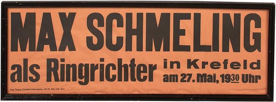 Maximillian Adolph Otto Siegfried "Max" Schmeling became Heavyweight Champion of the world a week after he refereed this fight in Krefeld, Germany, on May 27, 1930. This interesting old quaint paper sign measures 8x23" framed for the actual event or shortly after. The name Max Schmeling is in expansive, bold letters. Overall EX condition.