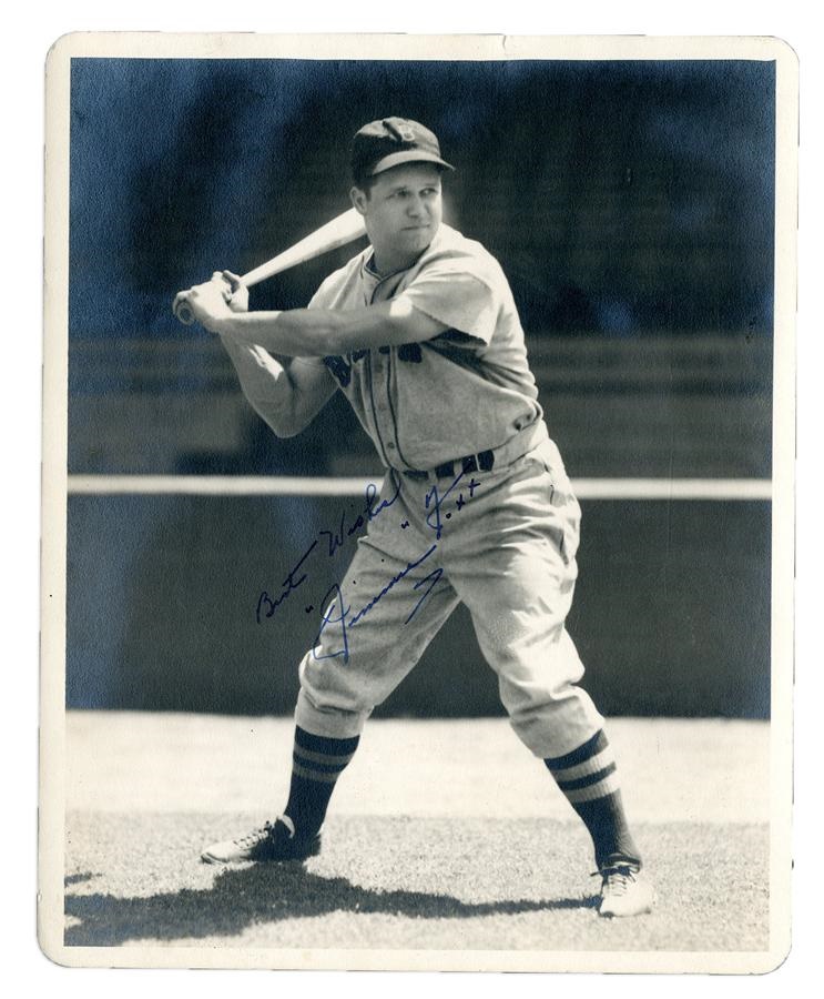 It's difficult to imagine a nicer signed image of "Double X" than the offered piece. Legendary photographer George Burke has captured "The Beast" in all his glory at bat, as he looks towards the camera with grim determination. Rarely do you see an unpersonalized 8x10", but the famed slugger has penned his name ("Best Wishes Jimmie Foxx") in bold, 10/10. The photo itself features a George Burke photographer's stamp on the verso. In NRMT condition, this is a spectacular piece worthy of inclusion in the finest baseball autograph or signed photo collection.