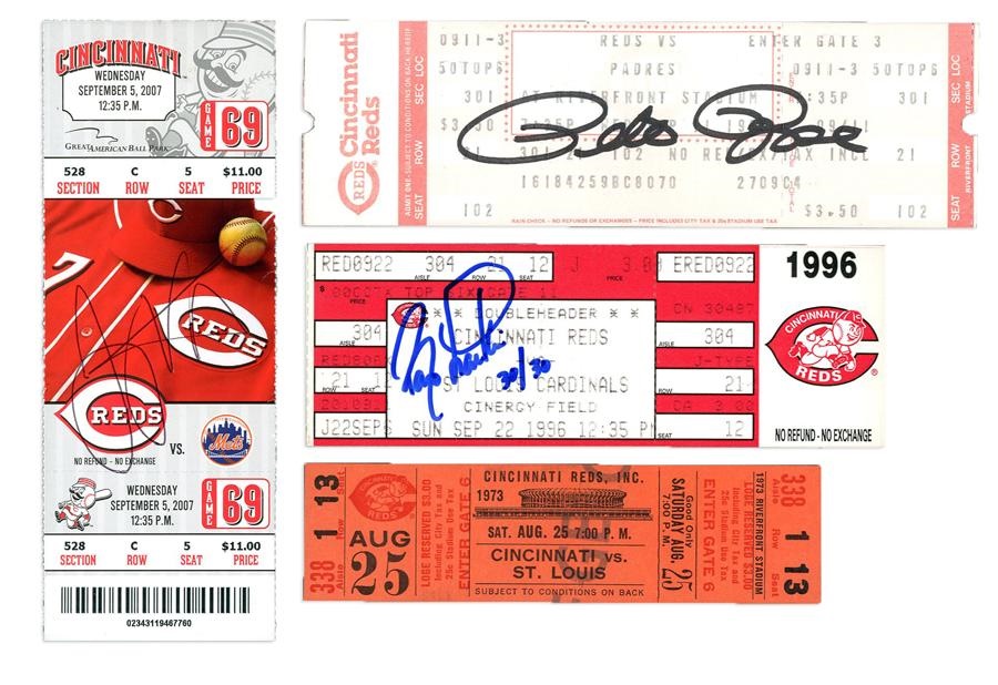 One of the toughest records to break in all of sports is Pete Rose's 4,256 hits. Featured in this lot is an actual unused ticket from Charley Hustle's 4,192nd second hit, signed in black marker. Alongside the Rose ticket are other Cincinnati Reds tickets including one signed by Joey Votto from his first game, one signed by Barry Larkin with 30/30 inscription, and an unused ticket from Ken Griffey Sr.'s first game in which he got two hits. All are NRMT.