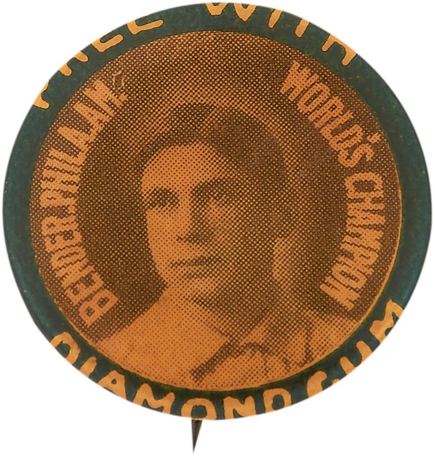 Given it's 105 years of age, this Chief Bender Diamond Gum pin is in beautiful condition, NM to be exact. Very tough to find and the condition just adds to the display quality. The pin reads "Free With Diamond Gum" on the outside, and "Bender Phila, AM, World's Champion." Condition is NM.
