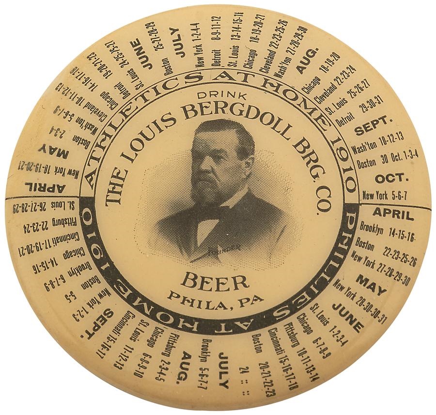 Contrary to modern day mini-schedule books, this early 1900s example of a schedule is in pin form. The pin depicts the schedules of both Philadelphia A's and Phillies for the 1910 season. Great advertising for Louis Bergdoll Brewing Co. Beer reads "Drink The Louis Bergdoll BRG Co. Beer, Phila, PA." The back doubles as a mirror and shows two rusting lines.