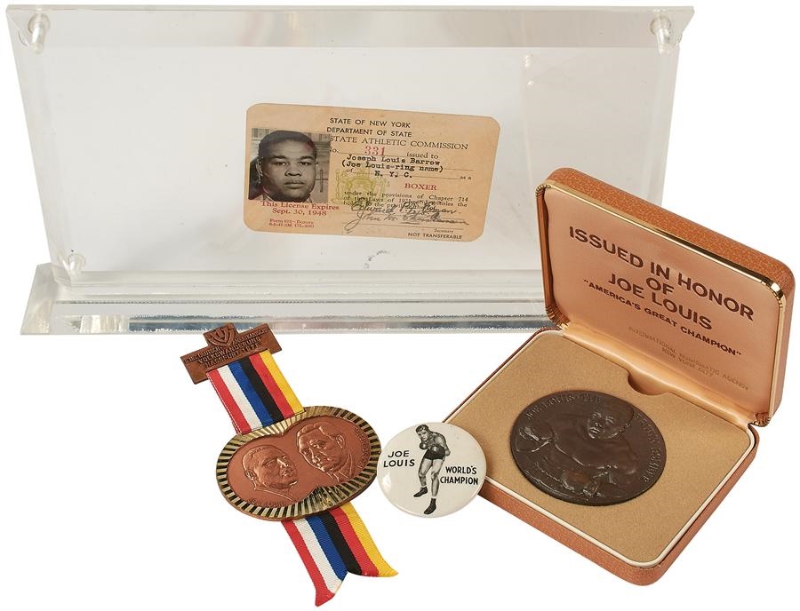 Talk about a license to kill. One of the meanest hombres ever to enter a boxing ring - Joe Louis Barrow - was issued license #331 from the New York Department of State - State Athletic Commission. It expired on Sept. 30, 1948, six months before announcing his retirement. This lot comes with Louis' World's Champion pin, Joe Louis/Max Schmeling 1975 bronze Volkswanderung commemorative medal and tribute to Joe Louis bronze coin.