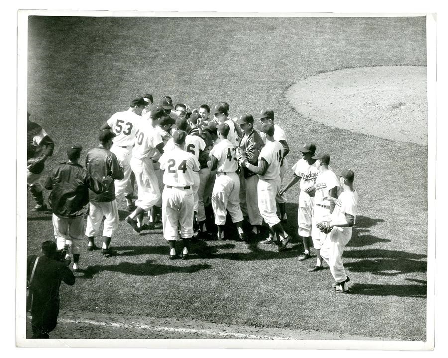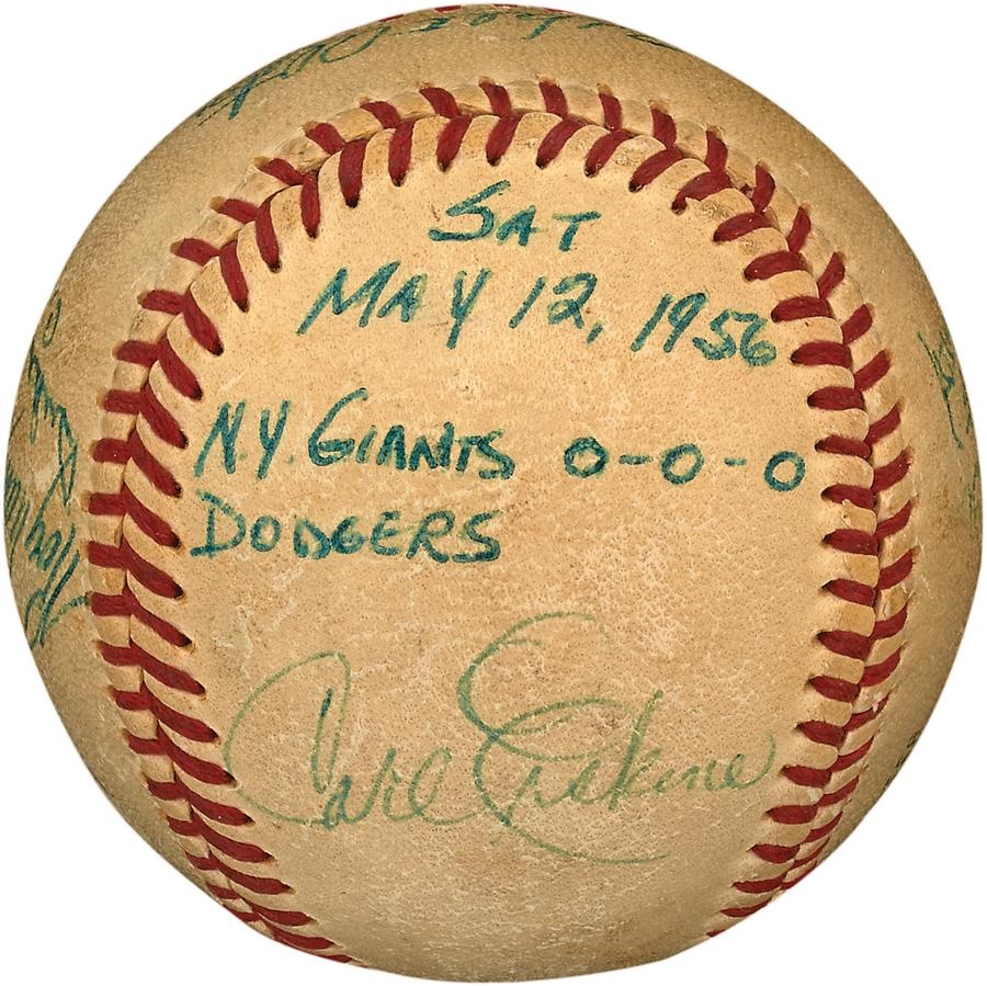 The second of Carl Erskine's no-hitters came at the expense of the crosstown rival New York Giants on May 12, 1956, at Ebbets Field. Now you can own a piece of baseball history as this official National League (Giles) baseball wasn't simply used in the game, but it is actually the final out ball that Erskine fielded off the bat of Alvin Dark and fired to Gil Hodges to finish off the masterpiece. After the game, Erskine had some of his teammates sign the ball, and those signatures range from 2-8/10 and include Campy, Jackie, Snider, Gilliam, Amoros, Reese and Hodges among others, with most players having added their position after their signatures. Erskine also signed and notated the ball: "Sat. May 12, 1956 NY Giants 0-0-0 Dodgers." The ball comes from Erskine's personal collection, and he has signed an LOA attesting to this. The baseball shows nice use and comes with Type I photo from the game itself.