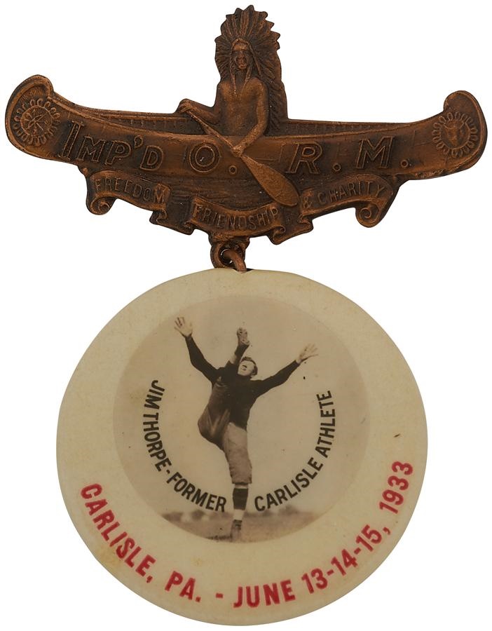 Jim Thorpe is arguably one of, if not the most prolific athletes in sports history. With his level of talent for every sport he participated in, he became a champion in many fields. This pin dates back to June 13-14-15, 1933, on which Thorpe was the headline for an event in Carlisle, PA. Attached to the pin is a figural metal Indian hanging. NM condition.