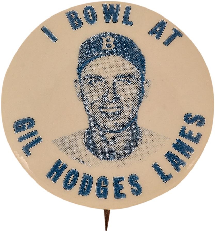 A fan favorite from his playing days in Brooklyn, this classic pin is from Gil Hodges' stint as a bowling impresario. This is nicest known specimen of its kind, boasting "I Bowl at Gil Hodges Lanes," and the pin is in NM+ condition.