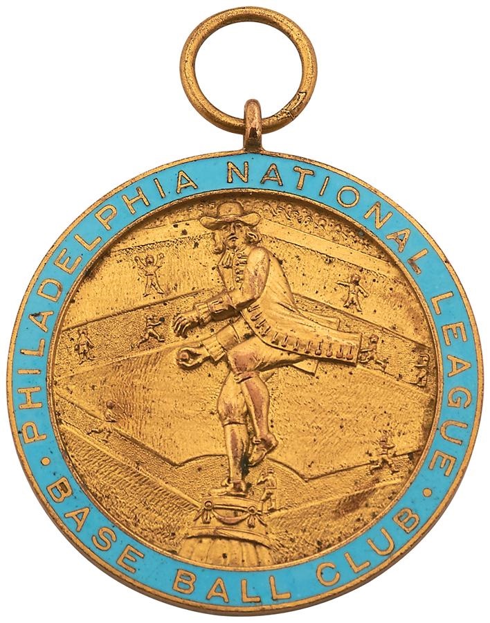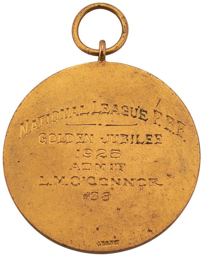 Dating back to 1925 comes this circular Golden Jubilee press pass. Measures 1.5" at the diameter and is NM. Back reads "National League P.B.B, Golden Jubilee, 1925, Admit, L.M. O'Connor #38"; O'Connor was a well-known NL executive.