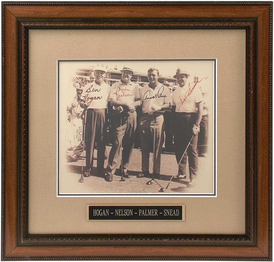 You'd be hard-pressed to find a more formidable foursome than the quartet of golfing legends who lent their signatures to this special 8x10" framed and matted photo. The lineup includes Ben Hogan (7/10), Byron Nelson (6/10), Arnold Palmer (8/10) and Sam Snead (6/10). The photo appears EX and the entire frame measures roughly 15.5x15".