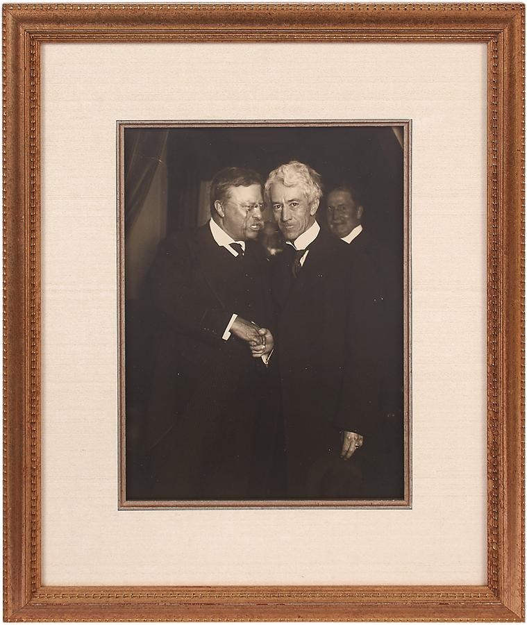 This is an exceptional Teddy Roosevelt with Kenesaw Mountain Landis vintage and original candid photograph, merging politics and baseball in the earliest days of the 20th Century. This beautiful framed photograph measures 13.5x16.5" and is a Type I, dating from 1905, when Roosevelt appointed Landis a federal judge. The appointment was prodigious as Landis ultimately came to national prominence when he fined Standard Oil, and was forever seen as a judge determined to protect the populous from big business. He was the first Commissioner of Baseball, and remembered for his handling of the Black Sox scandal, in which he refused to back down and expelled eight members of the Chicago White Sox, refusing them reinstatement and instilling faith back into the game. In a gold-gilted frame and matted with a beautiful tapestry finish, this classic photo is in NRMT condition.