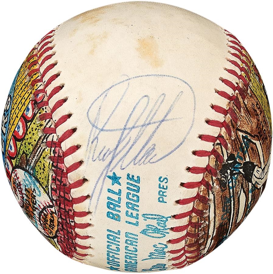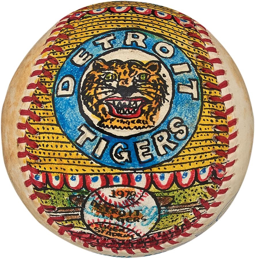 A wonderful piece of folk art, this ball was done by noted talent George H. Sosnak in 1978. It is is dedicated to Rusty Staub and the Detroit Tigers, Sosnak's favorite team. Hand painted, his tiger head is always dazzling and slightly different each time. Includes exceptional art work and and autograph of Staub, as well as statistics and a bio of the man. Rusty's autograph rates 8/10, and this ball is in VG-EX condition overall.