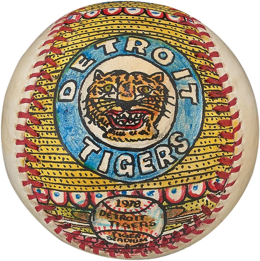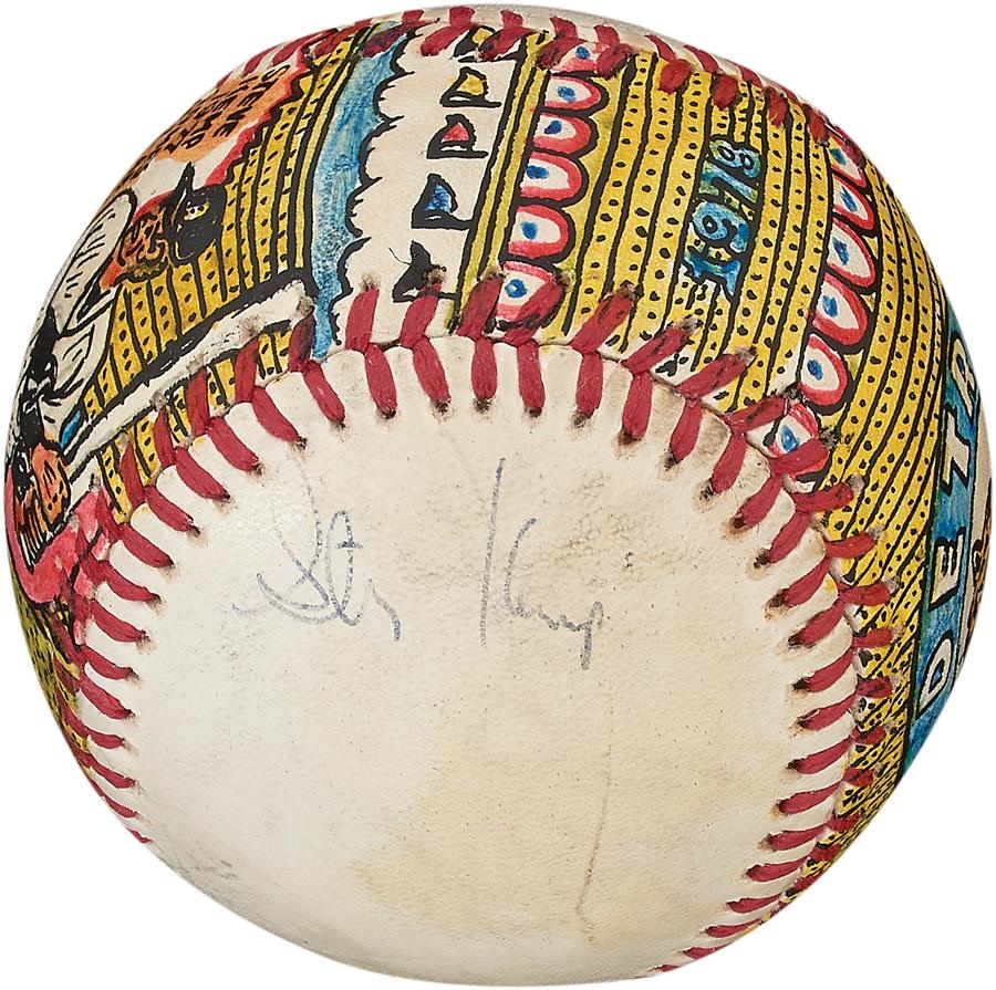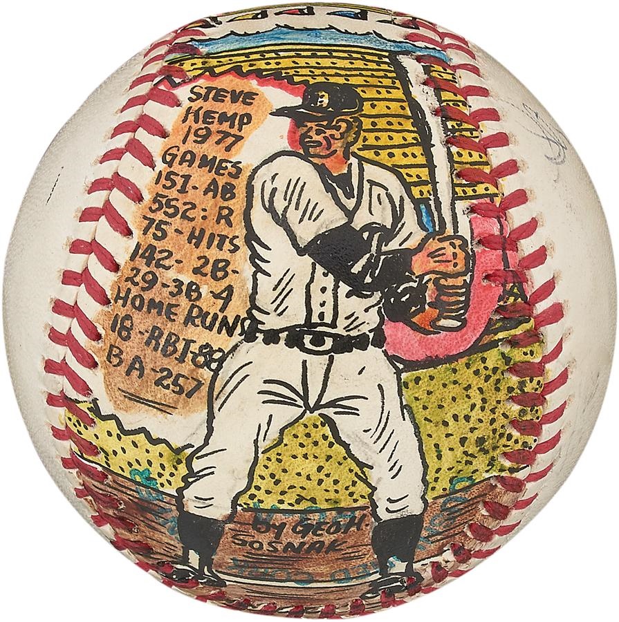 George H. Sosnak created this wonderful piece of folk art in 1978. The noted artist dedicated this piece of rawhide canvas to Steve Kemp and the Detroit Tigers. Hand-painted, his tiger head is always striking and slightly different each time. The ball includes exceptional art work and and autograph from Kemp, as well as statistics and a brief bio. Kemp's autograph is 7/10, and the ball is in EX condition overall.