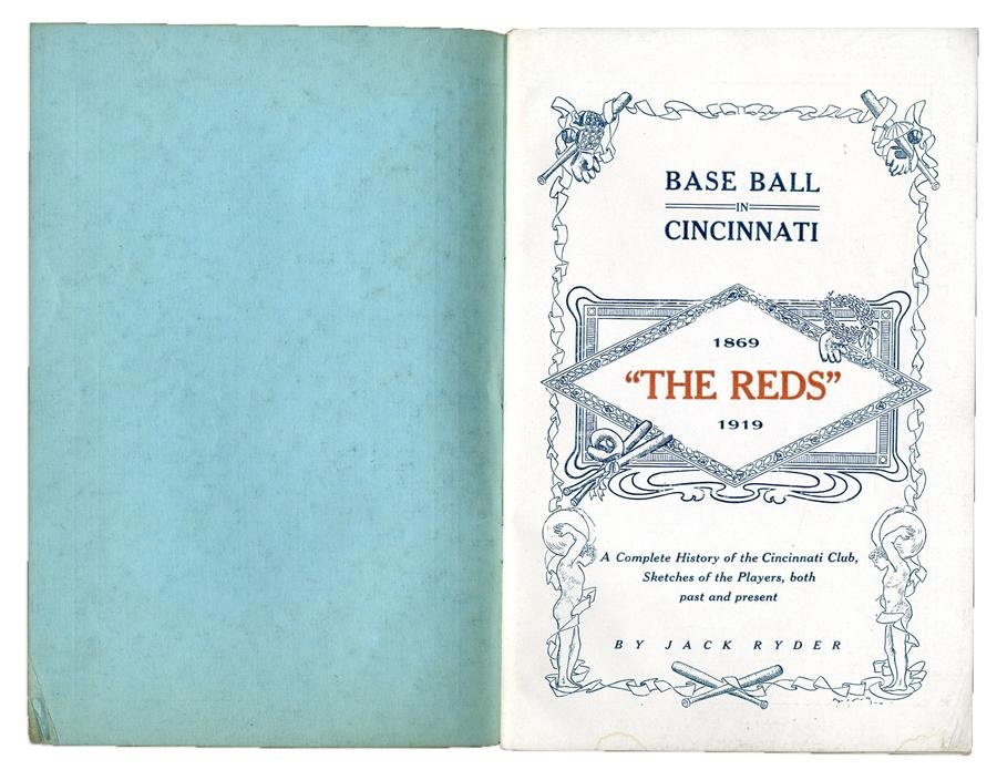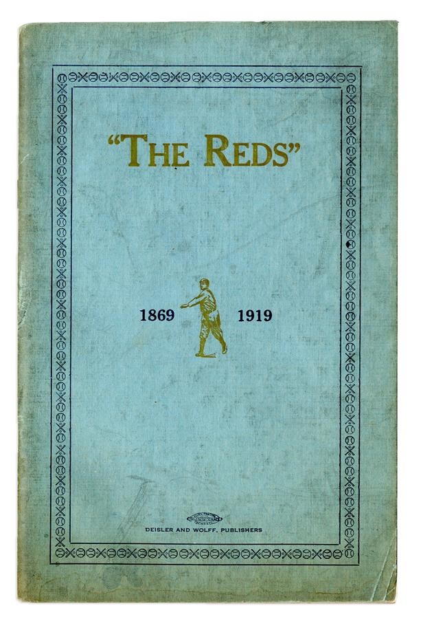 From the year the Reds played the World Series against the infamous 1919 White Sox, this previously unknown Reds Yearbook only has a title page and is supposed to be a complete history by Jack Ryder not by Henry Ellard who wrote the book of the same title. What's even more unusual in that there is a second page discussing "The Red's 1919 Leader" Patrick J. Moran with a full-page biography and then, nothing else the rest of the book is completely blank! A full 40 or 50 pages of nothing. Measures 6.25x9.5" and condition is VG+-EX.
