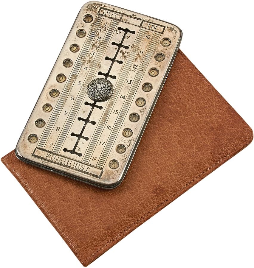 Intended only for the very rich, this opulent and very handsome, heavy sterling silver scorer reads "Pinehurst" and is in the original leather slip case Pinehurst is most important to the game of golf; created during the 1890s in the pine barrens of North Carolina, it's a place like no other - a New England village for a game that was just gaining popularity in the United States. Scorer measures 3.25x2" and is in EX-NRMT condition.