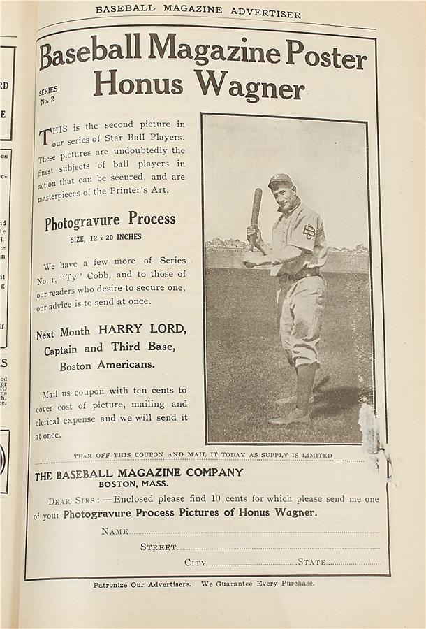 Honus Wagner "Big Smoke of Pittsburgh" cover plus Honus Wagner ad for Baseball Magazine poster inside. VG-EX.