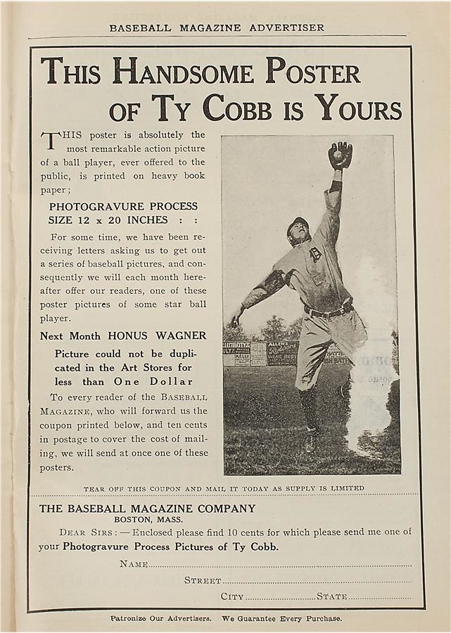 Featuring the famed image of him being the first U.S. President to throw out the First Pitch, with a wonderful ad for Ty Cobb Baseball Magazine poster inside. This has cover edge tears and chips, otherwise in EX condition.