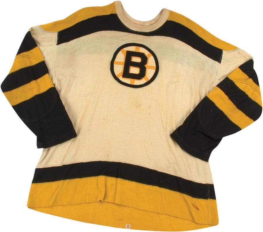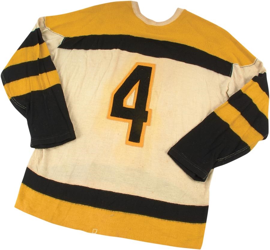 Hard-hitting defenseman Bob Armstrong was appropriately named as he was one of the sport's major scrappers, engaging in a multitude of fights. A mainstay on the Boston Bruins' blue line for each of his 542 career NHL games, Armstrong wore this terrific vintage wool jersey during the 1958-59 season, which saw the B's go 32-29-9. It includes a Size 48 tag and the #4 that would be issued to the legendary Bobby Orr seven years later and then retired. Armstrong managed a goal and nine assists for the Bruins during the 1958-59 season, his eighth of 11 in Boston. The super sweater shows great use with a few pull marks and likely blood stain on the bottom.