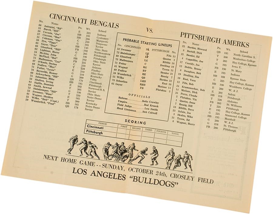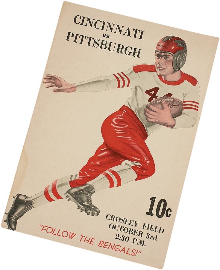 Long before Andy Dalton and A.J. Hill roamed the gridiron, another franchise known as the Cincinnati Bengals played between 1937 and 1942 at Crosley Field. From those early days of pro football in the Queen City comes this very rare program from the team that played in the second American Football League. This one comes from their very first game, played on October 3, 1937, against the Pittsburgh Amerks. There are great vintage graphics on the cover. The program is technically VG but looks much nicer.