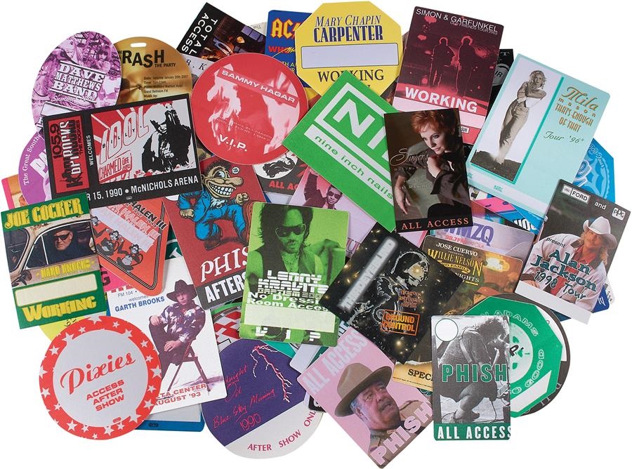 This incredible collection of mostly 1980s-90s unused backstage passes was obtained directly from Otto Printing & Entertainment, the company that made them and is still the prominent manufacturer. These are all 100% authentic and almost all are rock with some country, including major acts such as Pink Floyd (2), Eric Clapton, Paul McCartney, Journey, Doobie Brothers, Bad Company, Yes, J. Geils Band, Tom Petty, Moody Blues, Billy Idol, Rush, AC/DC, Tony Bennett, KISS, Neil Diamond, Phish, Bon Jovi, Aerosmith, Elton John, Van Halen, Prince, Bob Dylan, Lynyrd Skynyrd, Metallica, Tina Turner, Alice Cooper, Alice Cooper/Scorpions, Joe Cocker, Sting, Phish, Allman Brothers, David Byrne, B.B. King, Prince, Simon & Garfunkel, Paul Simon, Joan Jett, Spinal Tap, U2, Beach Boys and many more. There's more than one different of many of the top bands, there is some country and early rap, and amazingly there is almost no duplication! Some are laminates and some of them are laminated. All are in unused MINT condition There is even a Rolling Stones unused ticket! Approximately 300 passes in all.