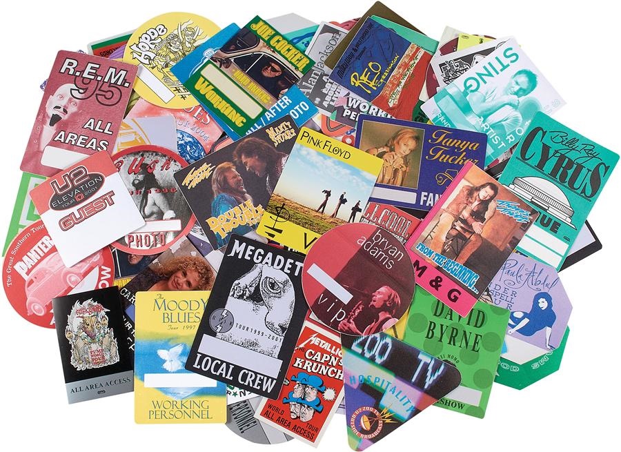 This incredible collection of mostly 1980s-90s unused backstage passes was obtained directly from Otto Printing & Entertainment, the company that made them and is still the prominent manufacturer. These are all 100% authentic and almost all are rock with some country, including major acts such as Pink Floyd (2), Eric Clapton, Paul McCartney, Journey, Doobie Brothers, Bad Company, Yes, J. Geils Band, Tom Petty, Moody Blues, Billy Idol, Rush, AC/DC, Tony Bennett, KISS, Neil Diamond, Phish, Bon Jovi, Aerosmith, Elton John, Van Halen, Prince, Bob Dylan, Lynyrd Skynyrd, Metallica, Tina Turner, Alice Cooper, Alice Cooper/Scorpions, Joe Cocker, Sting, Phish, Allman Brothers, David Byrne, B.B. King, Prince, Simon & Garfunkel, Paul Simon, Joan Jett, Spinal Tap, U2, Beach Boys and many more. There are more than one different of many of the top bands, there is some country and early rap. There is almost no duplication! There are some laminates and some of them are laminated. All are in unused MINT condition. There is even a Rolling Stones unused ticket! Total of 345+ pieces.