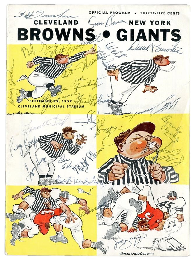 A great find, this Cleveland Browns program from 1957 covers Jim Brown's first game on September 29, 1957, and is autographed by all the players with Brown on the sweet spot. In that opening game, they beat the defending world champion NY Giants and after emerging as division winners, the Browns lost in the championship game that year to the Detroit Lions. Game results written inside, overall EX condition.