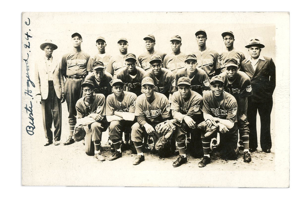 This rarest of real photo postcards originates from the collection of player Buster Haywood. The team was originally called "The Ethiopian Clowns" and was founded in Miami, Florida, in 1935 or 1936. This card is from 1943, when the Clowns joined the Negro American League and relocated to Cincinnati, Ohio, where they became the Cincinnati Clowns. They are wearing major health patches circa 1943-44, and the card is vintage signed by "Buster Haywood 24C." For clarification purposes, "24" is his uniform number, with "c" for catcher. Condition is NRMT, in uncirculated condition.