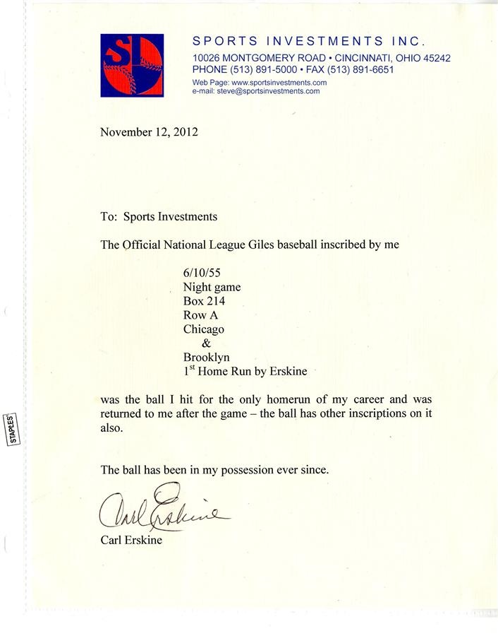 1955 was a dream season for the Brooklyn Dodgers and their fans, and pitcher Carl Erskine enjoyed arguably his best regular-season game on June 10 of that special season. Not only did the lifetime Dodger shut out the Cubs, 7-0, but he clubbed the only home run of his 12-year career in the fifth inning of that night at Ebbets Field. This is that very ball, which comes with an LOA from Erskine himself. The writing on the official National League (Giles) ball is a bit faded but still visible: "6/10/55 Night Game Box 214 Row A, Chicago & Brooklyn, 1st Home Run by Erskine." The fan who retrieved it gave it back to Erskine after the game and it remained in the right-hander's possession until now.