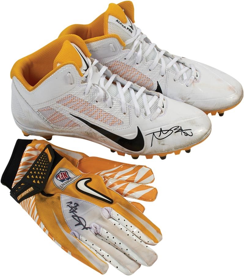 One of the NFL's most consistent and reliable receivers - Antonio Brown - ran some of his routes in these Nike cleats on December 7, 2014, as his Pittsburgh Steelers took on the divisional rival Bengals in Cincinnati. Brown caught nine passes for 117 yards in that 42-21 blowout win, improving Pittsburgh's record to 8-5. The shoes show light use and the right cleat is signed in 9/10 black Sharpie. A pair of Nike gloves that were worn during the 2014 NFL season are included here though we are unsure as to which game(s). The right-hand glove is signed in 8/10 black Sharpie.