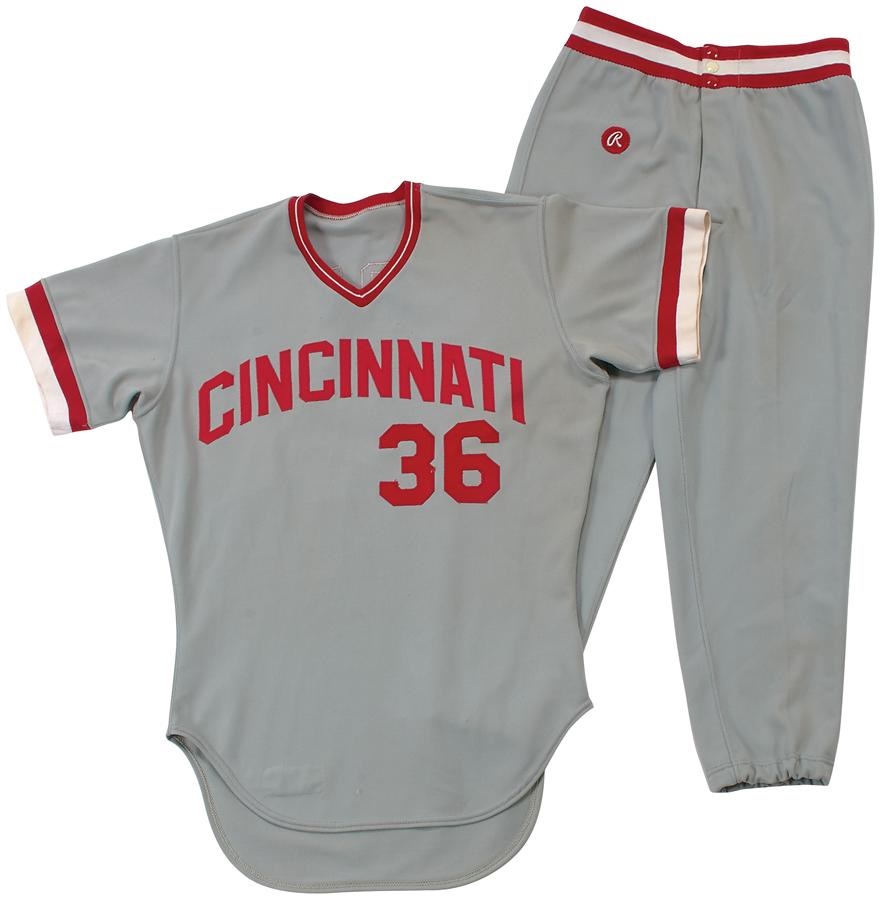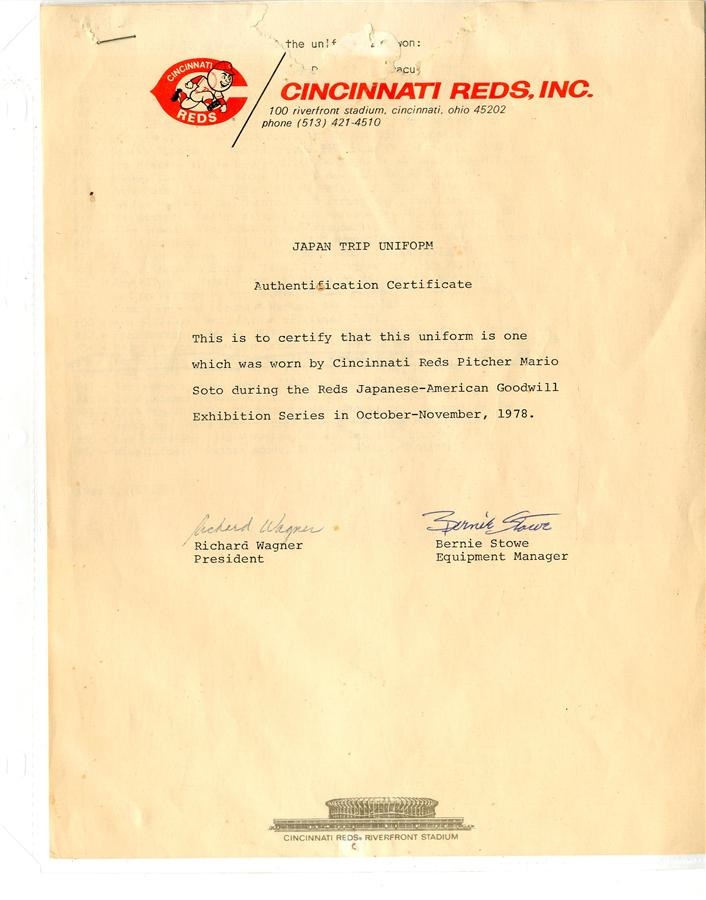 One-time Cincinnati Reds ace Mario Soto donned this road uniform during the team's 1978 Goodwill Tour of Japan. The jersey and pants are gray, with the top featuring "36" on the front and back, with "SOTO" above the number on the back. There is Rawlings Size 40 and "Set 2 1978" tagging inside the front tail, while the pants have Rawlings Size 32 and "Set 2 1978" tagging inside the waist band. The Rawlings logo is also sewn on the front of the right thigh on the pants. The uniform shows moderate use and is all original. The lot includes a vintage Reds LOA signed by Bernie Stowe and Richard Wagner.