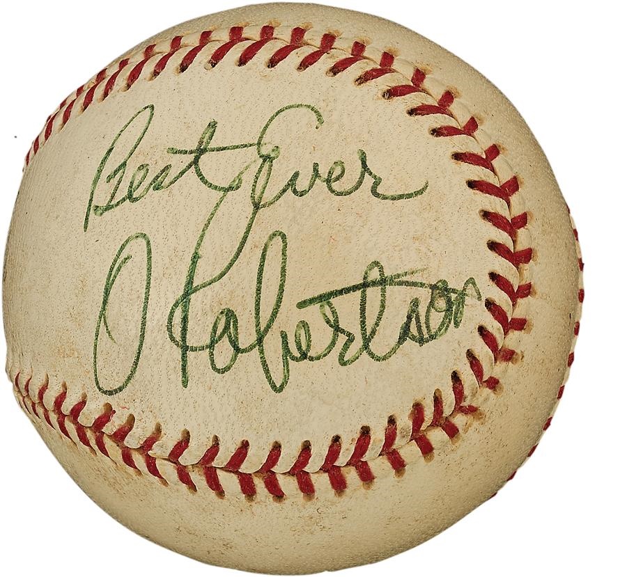Oscar! Oscar! Oscar! One of Basketball's greatest players signed this official National League (Giles) baseball, in vintage ink on a side panel: "Best Ever, O. Robertson." The Hall of Famer's signature grades 8/10 and the ball, which is dated by the original owner on another panel "Nov. 11 69," is in EX-MT condition. Comes with a PSA LOA with sticker affixed. It's unclear if Oscar was referring to himself when he wrote "Best Ever" - we may never know.