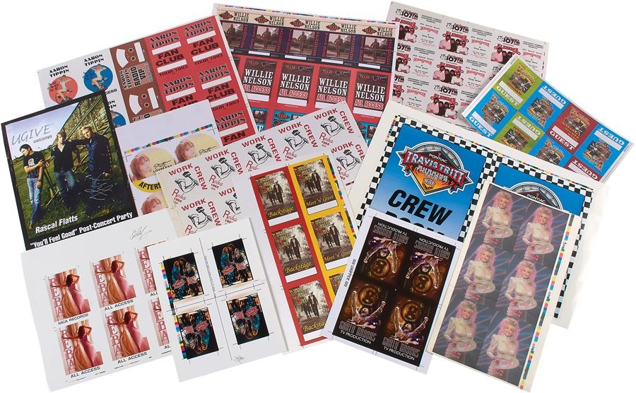 A huge collection with multiples for many different color variations of each, this lot of backstage pass original art, rare proof sheets (with colors missing or color variations), and uncut sheets covering country music and country rock. This lot features John Denver, Joe Diffie, George Strait (1988), Reba (1992), Tim McGraw & Faith Hill (1996), Willie Nelson, Marshall Tucker Band (2007), k.d. lang (1996), Hal Ketum, Dolly Parton, Travis Tritt, Alabama (1991), Loveless, Charlie Daniels Band, George Jones, Billy Ray Cyrus, Johnny Cash, Hank Williams Jr., Willie Nelson and other acts. The ones that are not dated are primarily from the 1980s and 1990s. Most are 15x17" with some smaller formats, and all are constructed of high quality, glossy, linen stock and were obtained directly from Otto Printing and Entertainment, who still produces the passes and tickets to this day. Overall EX-MT.
