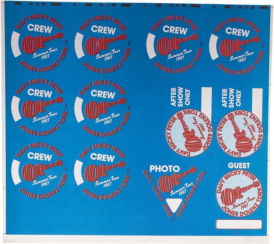 Unusual and rare, this uncut sheet of backstage passes is for the 1987 Monkees Tour. Created from sumptuous quality high gloss linen stock, the lot consists of eight "Crew" badges, two "After Show Only," one "Photo," and one "Guest." Measures 15x17.5" in total and is in NRMT condition, on the back is the adhesive with the protective paper applique that reads "Say No to Drugs." This was obtained directly from Otto Printing and Entertainment, who still produces the passes and tickets to this day.