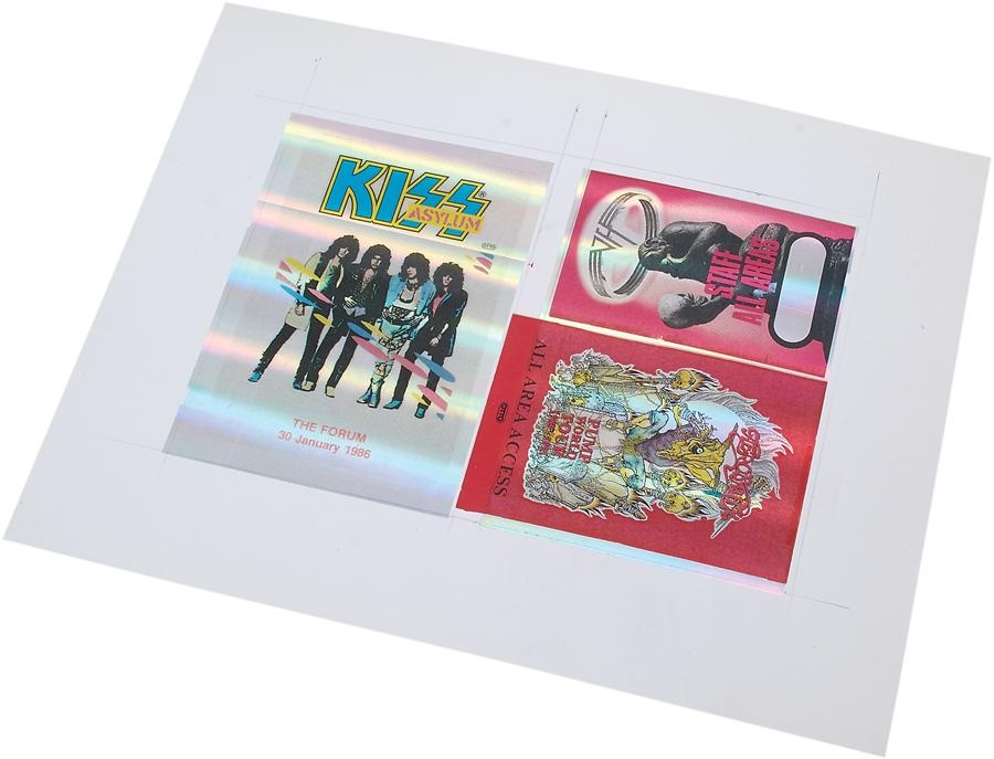 This backstage pass is a printers proof from the 1986 KISS Asylum tour and measures 8.5x11". Obtained directly from Otto Printing and Entertainment and in NRMT condition, it was printed for review with two other proofs. The KISS pass is oversized 5.25x3.75", not the same size as the finalized pass, and blank-backed.