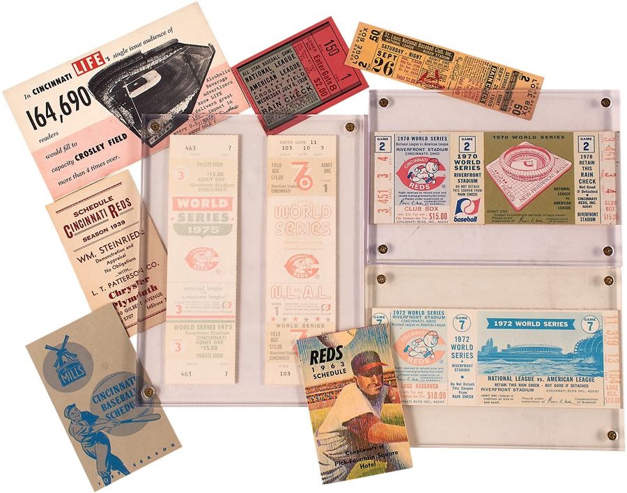 A cool group of stuff. TICKETS: 1) 1938 All Star stub at Cincy, EX+. 2-5) Unused World Series tickets (includes 1970 Game 2, 1972 Game 7, 1975 Game 3 and 1976). Colors are faded, otherwise NM. SCHEDULES: 6-8) All are Cincinnati Reds: two different 1939 (championship), and 1963 (Rose rookie), NRMT. 9) September 26, 1959, Sam Jones unused shortened no-hitter game ticket with Mays & McCovey home runs, NRMT. BLOTTER: 10) Perhaps best of all is a 1960s Crosley Field blotter advertising LIFE Magazine; NRMT and never before seen.