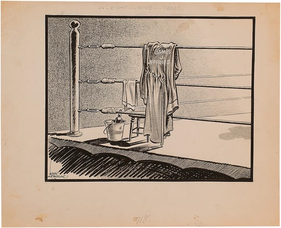Why is James Jeffries so forgotten? He was once considered one of the greatest Heavyweight Champions of all time by many fellow boxers and boxing experts. He is only remembered for the fight he lost against Jack Johnson and he was the only man to beat Jeffries; Johnson stated in an interview with Ring Magazine that Johnson thought Jeffries was the greatest. So, why is this man not remembered? This original art by Karl Hubenthal was most likely printed in the Los Angeles Times following his death in 1953. A very sad, moving tribute to a man that helped to change boxing forever. Measures 12x15" and was beautifully executed by the dean of west coast sports cartoonists entitled, "8.9.10."