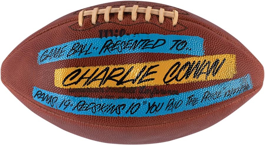This ball was presented to Charlie Cowan, an offensive tackle who played fifteen seasons in the National Football League with the Los Angeles Rams from 1961 to 1975. The hand painted, handsome ball reads "Game Ball Presented to Charlie Cowan Rams 19 Redskins 10 'You Paid the Price' 12/22/74." From the collection of the esteemed Helms Hall Sports Museum, and will come with letter of provenance/authenticity from Lelands.com. In NRMT condition.