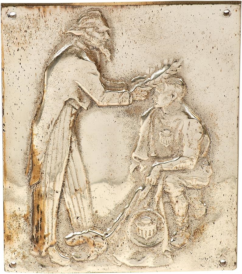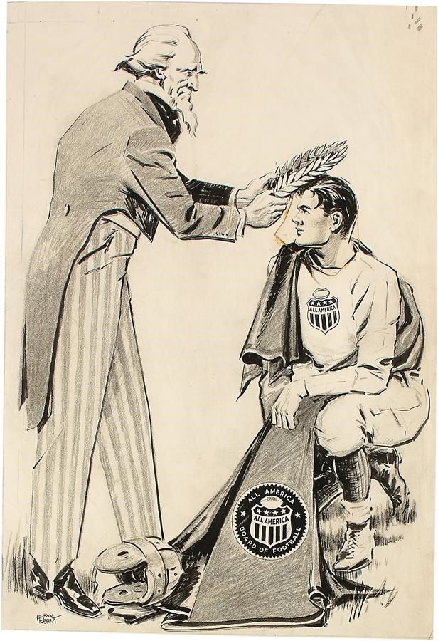 This unique lot is most probably from the original Christy Walsh collection, and is an unusual pairing of a silver plaque with the original art by Paul Frehm, used to create it. Frehm worked for King Features Syndicate and is most known for drawing the cartoon "Ripley's Believe it or Not!" A heavy cast iron plaque with a silver wash, it was meant to be put on a building or edifice. The political cartoon is excellent has the characteristics that make it desirable; great subject matter and superior execution. In the pen and ink drawing (and the plaque) Uncle Sam is anointing a symbol of American Football represented by a handsome, fresh faced football player. The drawing measures 12.5x18" and the plaque is 6x7". The plaque has some discoloration, but is overall EX and drawing EX-MT condition.