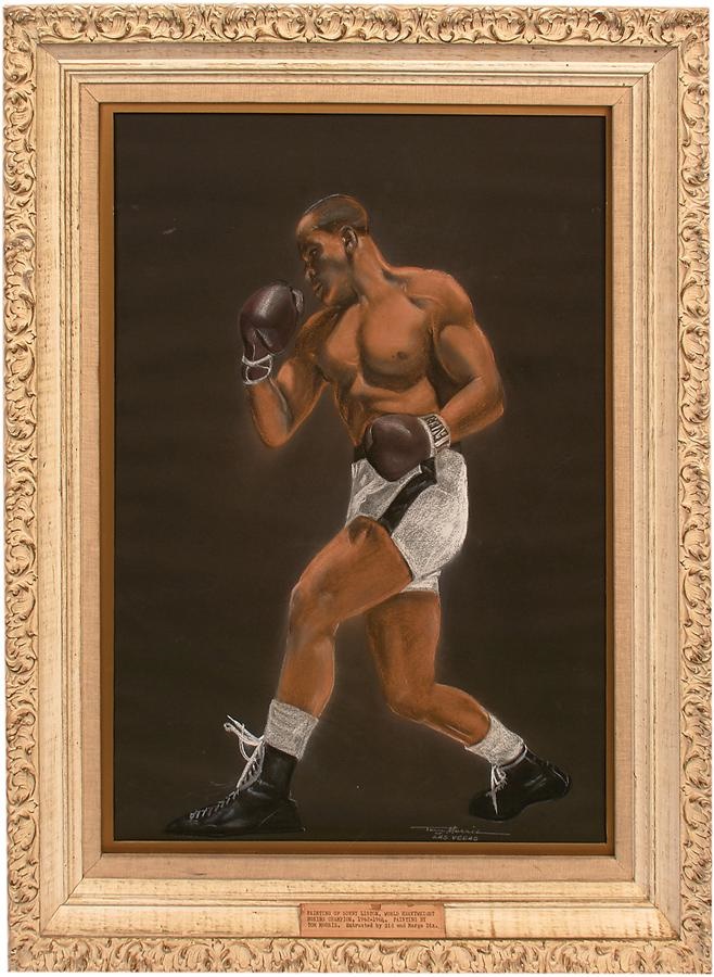 Capturing the strength of his form with excellent usage of light, this large, mixed-media vintage painting, oil paint, chalk and charcoal depicts renowned boxer Sonny Liston. A typed card-stock plate reads, "Painting of Sonny Liston, World Heavyweight Boxing Champion. 1962-1964. Painting by Tom Morris. Entrusted by Sid and Marge Dix," and the signature reads "Tom Morris Las Vegas." The included ornate original frame has an early 1960s feel and elegance. Measures 24x30" and is in EX-MT condition.