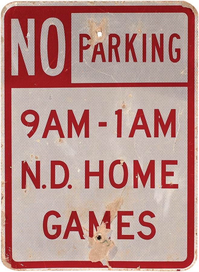 This fluorescent steel street sign was bolted to a pole and has somehow survived but was not meant to. From Notre Dame football games held in the 1980s, the heavy duty sign measures 18x24".