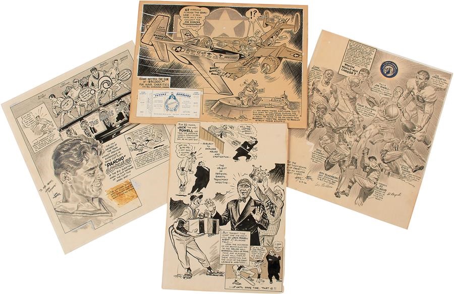 Here's a lot of four wonderful pen and ink cartoons by Karl Hubenthal, who was the Willard Mullin of the West Coast. He was the key sports cartoonist for the mighty Hearst Publications, and was "the guy" on the West Coast. 1) Spectacular 1944 football and WWII aviation-themed drawing has a 1944 ticket to Air Force Flyers vs. Randolph Field Ramblers right on it. 2) 1950 California football with a Helms theme is signed by five of the players: Guy Blackburn, Pete O'Garro, Ed Palmquist, Steve Turner and Jim Contratto. 3) "Happy Birthday" to Mr. Paul Helms of the Helms Museum with a tennis theme. 4) For Pacific Coast League baseball umpire Jack Powell, also mentions Helms in the drawing. From the collection of the esteemed Helms Hall Sports Museum and will come with letter of provenance/authenticity from Lelands.com. Average EX condition.