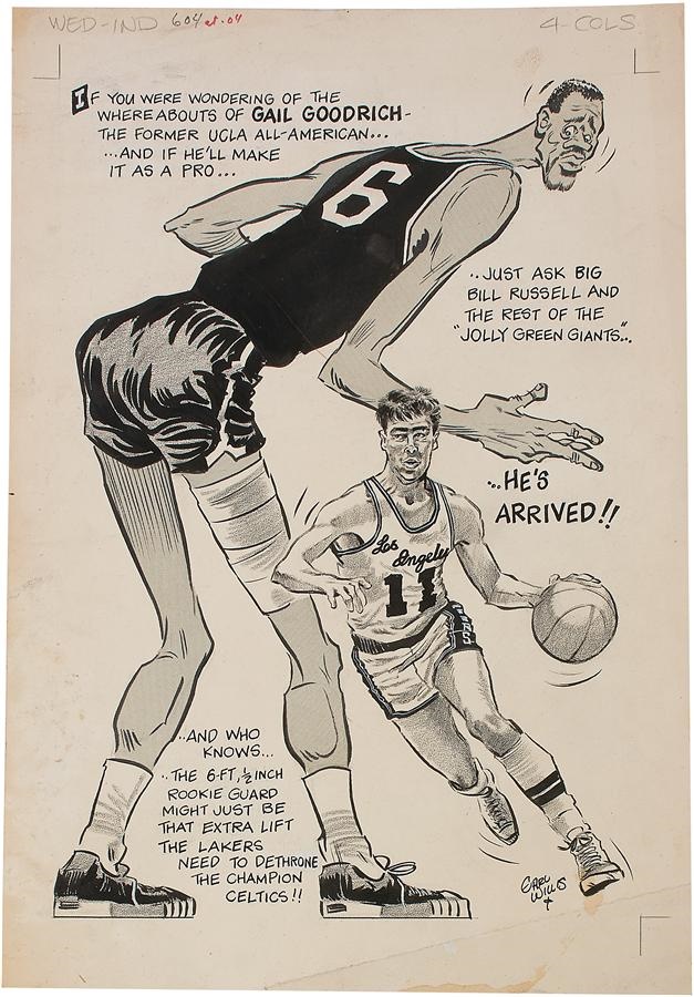 Great basketball "Jolly Green Giant" Bill Russell humor, also featuring a rookie Gail Goodrich. A Pen and ink cartoon by Karl Hubenthal who was the Williard Mullin of the West Coast. He cartooned mostly sport's themed artwork for Hearst publications, becoming the full-time editorial cartoonist in the 1950s, especially for the Herald Examiner and eventually Hubenthal's work was syndicated to other Hearst publications. From the collection of the esteemed Helms Hall Sports Museum and will come with letter of provenance/authenticity from Lelands.com. Measures 14.5x20.5" and is in VG+ condition.