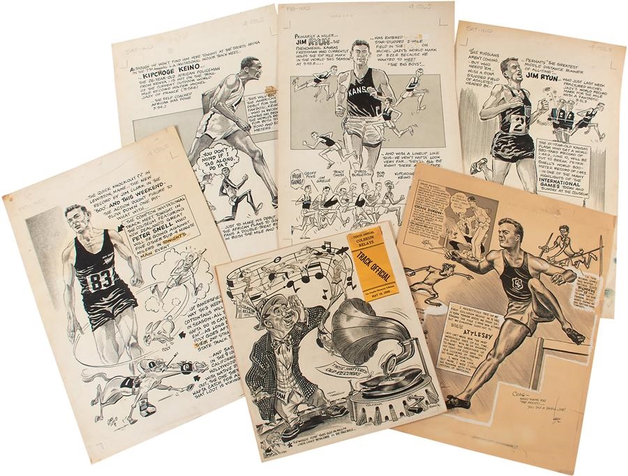 Six original art drawings, all pertaining to track and field and averaging 14x20", comprise this lot: 1) 1950 "Tenth Annual Coliseum Relays Track Official Los Angles Memorial Coliseum May 18th, 1950" with great artwork by Manning. Shows shattering of old records featuring an old victrola and sports fan. Comes with matching silk official's ribbon. The remainder are original artworks. 2-6) All are by the great Earl Willis (although one is unsigned). They are of Pete Snell, Dick Attlesey, two beauties of Jim Ryun, and one of the immortal Kipchoge Keino of Kenya. All are 1950s and 1960s, great cartoon artwork from the archives of West Coast newspapers. From the collection of the Helms Hall Sports Museum and will come with letter of provenance/authenticity from Lelands.com.