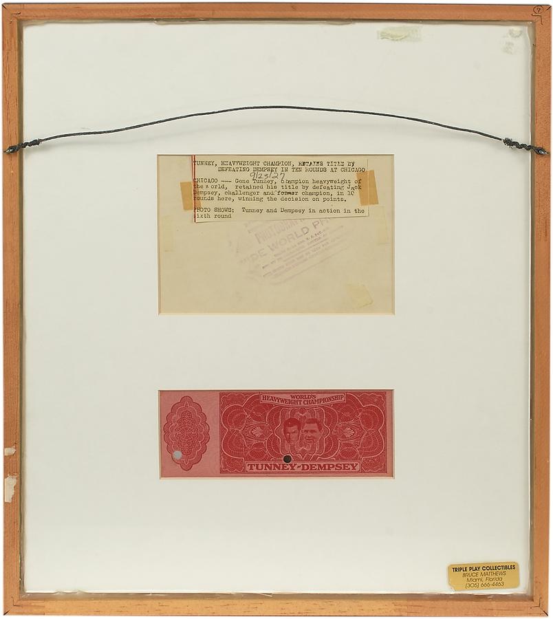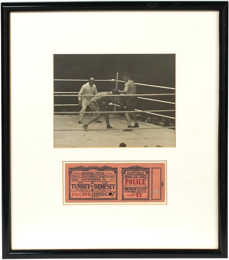 It remains the subject of debate nearly a century after the fact. Did the referee's long count help defending Heavyweight Champion Gene Tunney get off the mat and allow him to win the fight? This framed display with double-sided glass from that 1927 bout showcases an original wire photo from Soldier Field in Chicago, as well as a full ticket for "Police" that has two punch holes but is otherwise in EX condition. The photo has a caption on the back and appears EX.