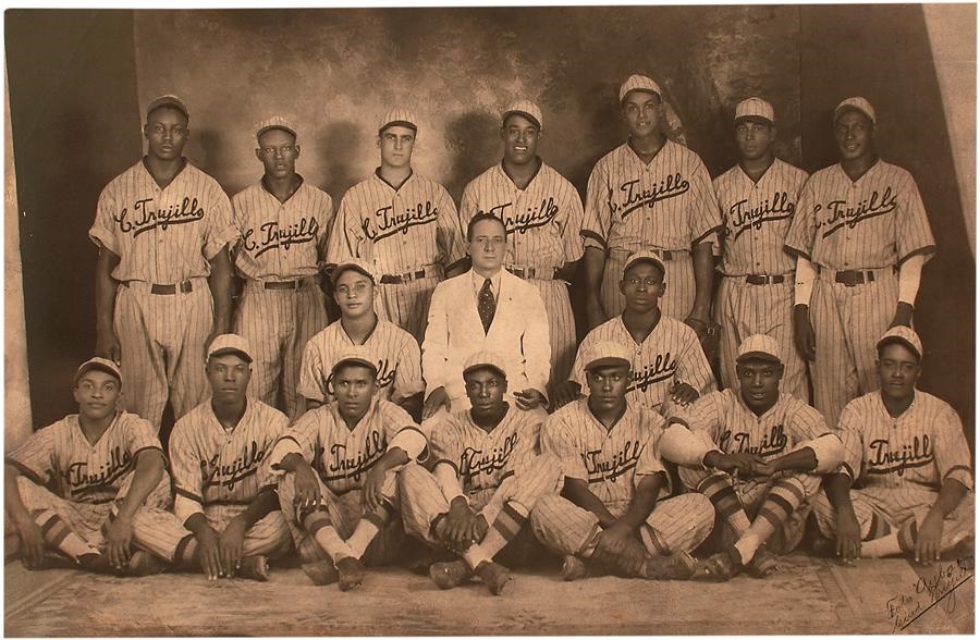 An oversized format presentation photograph on high quality double weight stock, this is of the legendary Ciudad Trujillo team. Considered by many historians to be the greatest team of all time, pictured is Satchel Paige, in the center next to the club president, Dr. Ayb, and Josh Gibson is seated in the back row, far left. Cool Papa Bell is seated in the front row center and Lazaro Salazar is also in the center. Sam Bankhead, Bob Griffith, Leroy Matlock, Cy Perkins, and Sylvio Garcia are also identified in the photo. The actual story and the shocking political backdrop has all the components for a compelling story; a brutal dictator of a small Central American country with the bloodiest regime in history, responsible for the deaths of more than 50,000 of his citizens and retains power through violence and corruption, decides he want to sponsor a baseball team to beat the team of his political opponents. Trujillo sent his henchmen to the U.S. with $30,000 and instructions to recruit the best Negro League players in the United States to add to the Ciudad roster to help them achieve the championship. As they were fortified with a great sum of money, Trujillo's agents were able to persuade Satchel Paige, Josh Gibson, James "Cool Papa" Bell, Sam Bankhead, Bob Griffith, Leroy Matlock, Cy Perkins, and Harry Williams. According to sources which may have been overstated, their lives were threatened if they did not win. When the players arrived at the stadium for the seventh and deciding game of the championship series, they found Trujillo's troops lined up with rifles and bayonets along the first base side of the field. Fortunately for all involved they won the championship. This 13.75x21.375" photo is one of the finest known specimens of this championship photo, printed in 1937, with the finest resolution, contrast and clariy. These were only given to the players and are extremely rare especially in this large format. Has light creasing, overall EX to EX+.