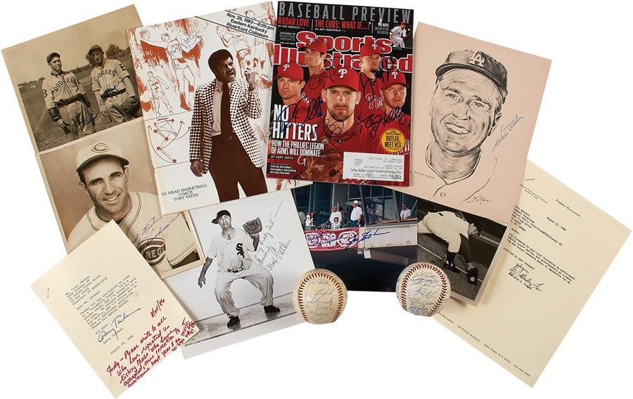 1) Van Mungo and Al Lopez vintage signed 8x10" as Brooklyn Dodgers (ex-Sal Larocca). 2) Walt Alston signed print by Volpe from the Sal Larocca Collection (gorgeous!). 3) Max Patkin vintage signed high quality Maurice Seymour publicity photo, 8x10", inscribed. 4-5) 1986 Garry Trudeau and Malcom Forbes matching signed TLSs. 6) Ted Kluszewski vintage signed 4x6" Cinn Reds publicity photo. 7) Ival Goodman vintage signed 8x10" Type I press photo. 8) 1983 Univ of Cinn basketball program vintage signed by Tony Yates. 9) Marty Brenneman, Joe Nuxhall signed 8x10" as Reds announcers. 10) 2011 Philadelphia Phillies pitcher signed Sports Illustrated (Lee, Oswalt, Hamels, Blanton, Halladay). 11) 1964 LA Dodgers team baseball with 23 signatures on ONL. All the keys are here: Koufax, Drysdale, Alston. Overall EX. 12) 2001 SF Giants team signed OML baseball with 25 signatures. NM. Team balls may have a few secretarials, everything here is otherwise guaranteed 100% authentic and will come with Lelands.com LOA.