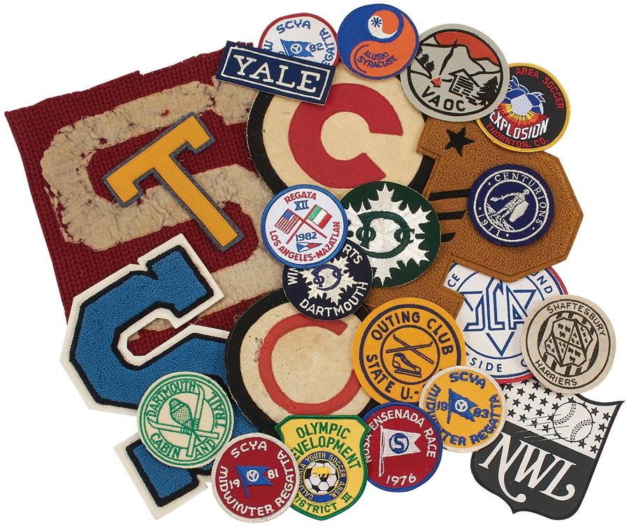 There are some great very early patches: 1) Letter "S" section from a 1910s Stanford Letterman's sweater or jersey. 2) Stanford letterman's "S." 3-7) 1970s-80s regatta patches (5). 8) Yale (football?). 9) 1911 Centurions. 10-12-14) Three 1950s Dartmouth Olympic Carnival (skiing). 15) JLA Price Playground Westside Center (Jewish). 16-17) Best of all could be two early 1900s "C" sports uniform jersey patches in red, white and black. 18-24) NWL baseball, soccer, and more. From the collection of the esteemed Helms Hall Sports Museum and will come with letter of provenance/authenticity from Lelands.com. NOTE: Some or all of these pieces could well be from major events or used by famous athletes and from special donors. Many of the Helms pieces were unidentified with their source information having been lost through the years. However, through photo analysis we were able to prove things previously unidentified by Helms to be very important artifacts. Do your own research and you may have some real treasures here.