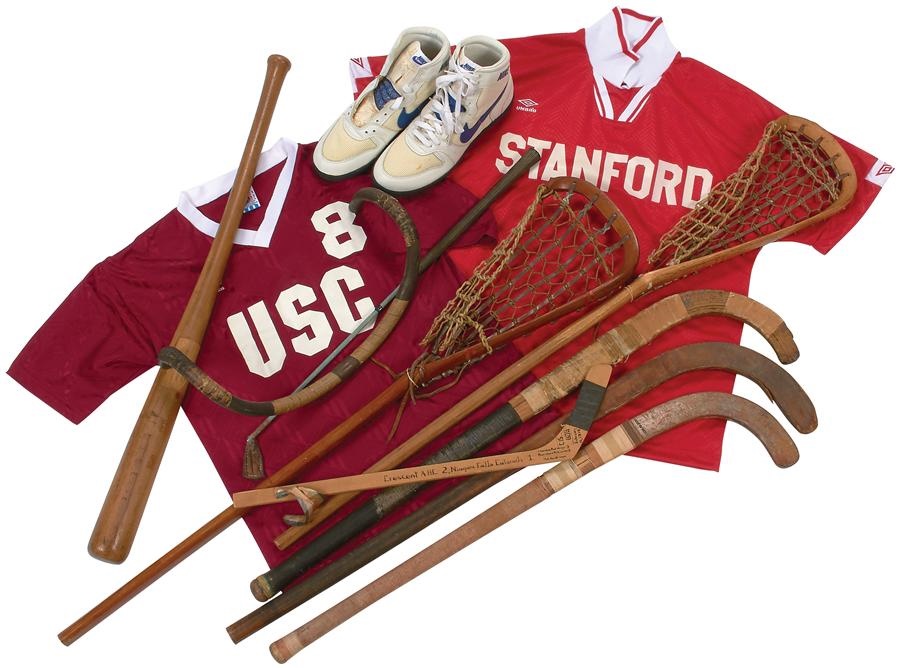 This lot of important historical material is unidentified, easily could be from important events and major athletes based on the fact that all are from the Helms Museum and the original donors' source information has been lost through the years. Through photo analysis we have been able to match items previously unidentified by Helms to be very important artifacts. Do your own research and you could have some real treasures: 1-4) Four antique wooden field hockey sticks (one is a Peerless, one reads "Crescent AHC 2 Niagara Falls Cataracts 1, Jamaica Red Wings 3 Morristown Milliners 2"). 5-6) Two antique wooden lacrosse sticks with catgut strings (one reads, "Mayor F.J. Hume New Winchester British Columbia"). 7. Unusual "Hawaiian Monkey Pod" baseball bat reads "American Legion" with a Hawaiian address. 8) Unidentified horse riding crop. 9-10) Two women's soccer jerseys. 11) Pair of vintage 1980s Nike Pro shoes which were never used, but have some deterioration in the tongue of one of the shoes. Overall condition EX or better.
