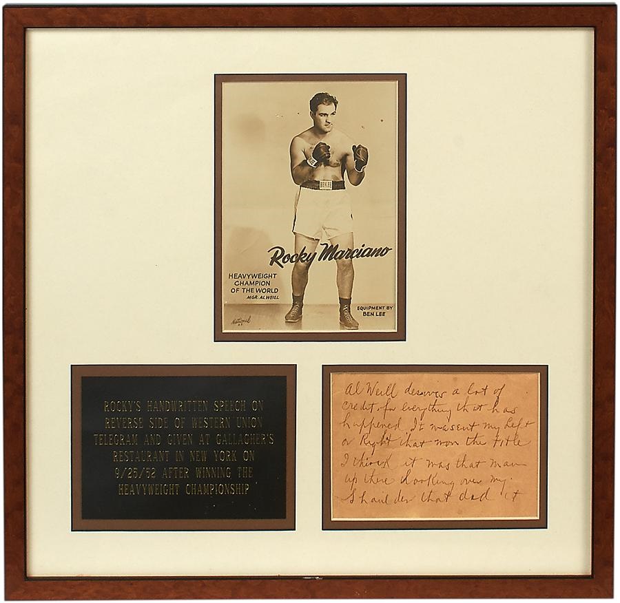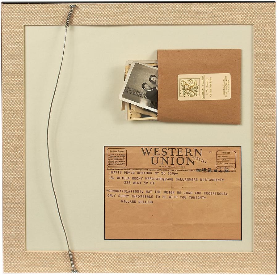 The "original" Rocky of the ring is the center of attention in this framed (double sided glass) display with a promotional photo and plaque. Marciano's own hand-written notes are on the back of a telegram from Willard Mullin that congratulates the fighter on his championship. The speech was made at Gallagher's Restaurant in New York City on Sept. 25, 1952, and the notes in pen read: "Al Weill deserves a lot of credit for everything that has happened. It wasn't my left or right that won the title, I think it was that man up there looking over my shoulder that did it." The lot also includes seven vintage snapshots of Rocky with his friends and family.