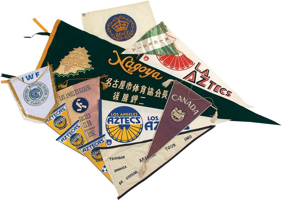 Total of 20 flags and pennants, mostly soccer. 1) The largest is from Nagoya, Japan, beautifully constructed felt with sewn on lettering and illustrations. Truly marvelous and measuring 24x58". 2) Canada British Columbia Football Association (21") made of canvas and backed with satin. 3) Nigerian soccer with gold embroidery, green and white satin. 4) 1960 Trinidad-Jamaica World Tour, white cotton with blue trim. 5) Rare 1952 Los Angeles Kickers Soccer Club. 6) BE&CG. 7) International Weightlifting Federation (two-sided). 8) SZM CSSR soccer flag in plastic (medium). 9) Large flag "Parma AC Soccer" with Parmalat advertising and 1991-93 trophies. 10) FC Internationale Milano founded 1908. 11-20) Ten felt pennants from the 1970s Los Angeles Aztecs soccer club of varying sizes. From the collection of the esteemed Helms Hall Sports Museum and will come with letter of provenance/authenticity from Lelands.com. Condition overall is EX to NRMT.