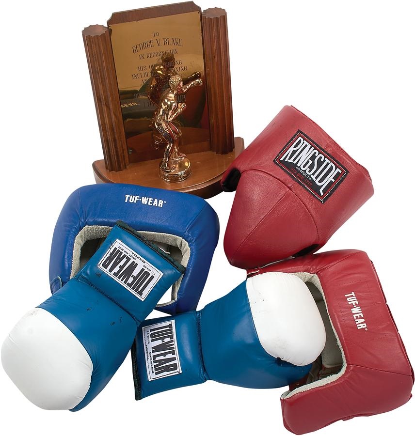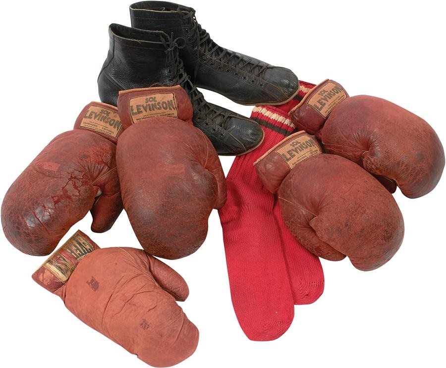 Some of this is unknown and unmarked but all are from the Helms Hall Sports Museum; the unknown equipment is from professional or major fighters. 1-2) Two pairs of 1933 heavy leather "Sol Levinson" worn leather boxing gloves with some breaking in the pads of the palm, otherwise EX condition. 3) Pair of worn leather boxing shoes with laces. 4) Willie Pep's actual socks with the original Helms inventory tag from the 1940s. 5) Everlast single boxing glove in well worn condition. 6-9) Two sets of professional leather Tuf-Wear headgear from 1992, matching pair of Tuf-Wear professional boxing gloves and "Ringside" crotch protector. Could be from the 1992 Summer Olympics in Barcelona, Spain. 10) Handsome 1949 boxing award (10.5x13") presented to George V. Blake in 1949 in brass and wood from the Loyola Boxing Club. George Blake officiated some of the most famous bouts of the 1920s and 1930s including Max Schmeling vs. Young Stribling, Joe Louis vs. Jack Roper, and Jimmy McLarnin vs. Young Corbett III. From the collection of the esteemed Helms Hall Sports Museum and will come with letter of provenance/authenticity from Lelands.com. NOTE: Some or all of these pieces could very well be from major fighters, major events, or from a special "famous" donor. Many of the Helms pieces were unidentified with their source information having been lost through the years. However, through photo analysis we were able to prove things previously unidentified by Helms to be very important artifacts. Do your own research and you may have some real treasures.